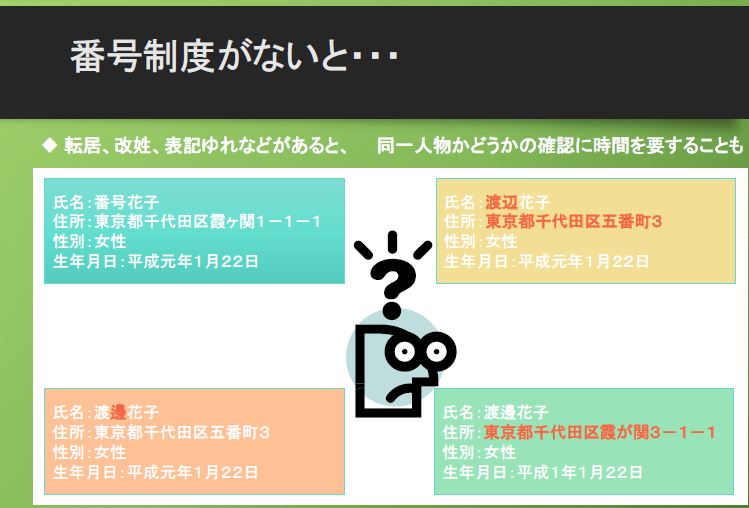 本人が申請してきたときに、「あなたは誰ですか」という情報が、氏名や生年月日等で把握されているという問題です。氏名だと外字等の問題もあり、また同姓同名もいます。変更もあります。そのため氏名等での照合は不効率なためにマイナンバーやその他の番号が活用されています。